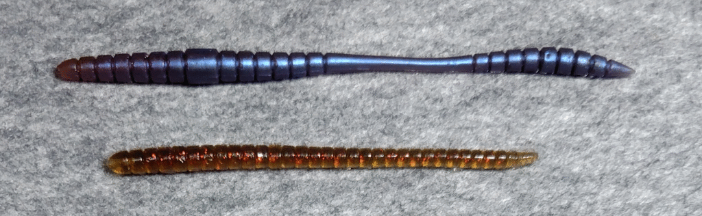 英語 worm(ミミズ)からきていて、形や動きがミミズや小魚、ザリガニなどのエサを模しているものや、いろんな形のワームがあります。